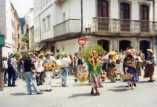 Then we started heading south, which took us to Viviero. We had not planned to stop there, but on the way through I spied a small group of costumed people parading down the sidewalk. I immediately did a U-turn and parked the car. As we were getting out of our vehicle, we were approached by two of the colorfully-dressed women, who gestured to Marie to join them. They proceeded to put a hat on her head, a shawl over her shoulders, and a basket of flowers to carry, as they joined the dance taking place. It was some kind of Springtime ritual, with the young bride and the Greenman. At the end of the episode, the ladies retrieved their belongings and said "adios." I think.